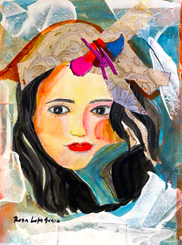 Base, acrílico, rosto,lápis pastel seco, adornos, colagem com papel crepo. Base papel aquareláveil 300 mg próprio para pintura